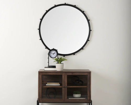 Large Round Wall Mirror. With a simple black metal frame, trimmed with dainty metal beads, the Elena mirror adds interest in an uncomplicated way.